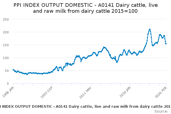 Download this time seriesPPI INDEX OUTPUT DOMESTIC - A0141 Dairy cattle, live and raw milk from dairy cattle 2015=100