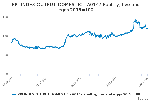 Download this time seriesPPI INDEX OUTPUT DOMESTIC - A0147 Poultry, live and eggs 2015=100