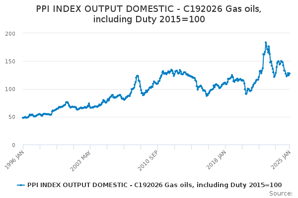 Download this time seriesPPI INDEX OUTPUT DOMESTIC - C192026 Gas oils, including Duty 2015=100