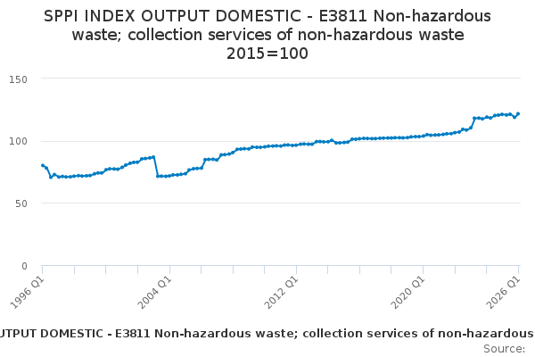 Download this time seriesSPPI INDEX OUTPUT DOMESTIC - E3811 Non-hazardous waste; collection services of non-hazardous waste 2015=100