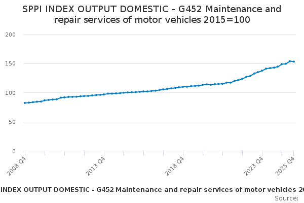 Download this time seriesSPPI INDEX OUTPUT DOMESTIC - G452 Maintenance and repair services of motor vehicles 2015=100