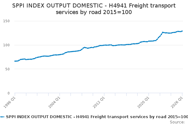 Download this time seriesSPPI INDEX OUTPUT DOMESTIC - H4941 Freight transport services by road 2015=100