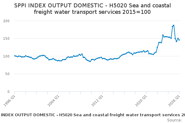 Download this time seriesSPPI INDEX OUTPUT DOMESTIC - H5020 Sea and coastal freight water transport services 2015=100