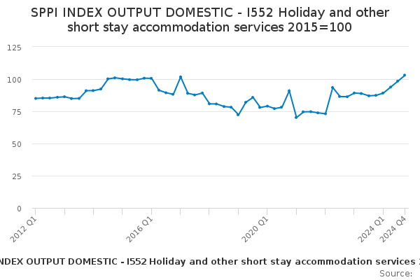 Download this time seriesSPPI INDEX OUTPUT DOMESTIC - I552 Holiday and other short stay accommodation services 2015=100
