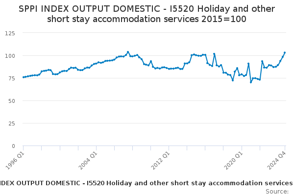 Download this time seriesSPPI INDEX OUTPUT DOMESTIC - I5520 Holiday and other short stay accommodation services 2015=100