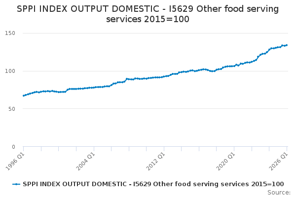 Download this time seriesSPPI INDEX OUTPUT DOMESTIC - I5629 Other food serving services 2015=100