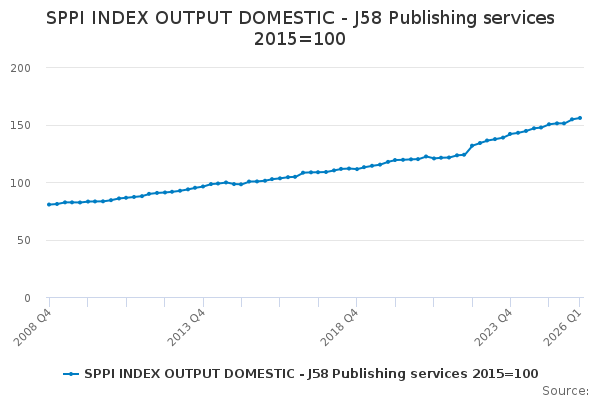 Download this time seriesSPPI INDEX OUTPUT DOMESTIC - J58 Publishing services 2015=100