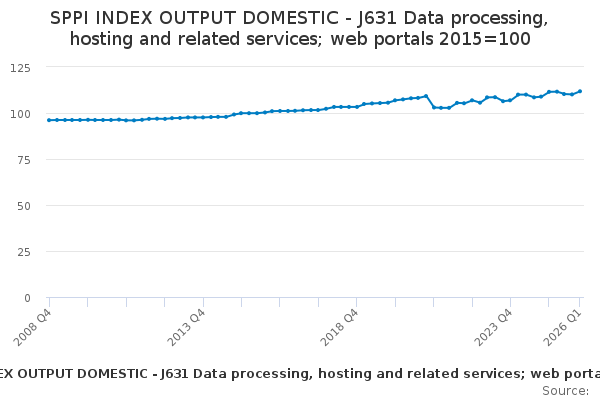 Download this time seriesSPPI INDEX OUTPUT DOMESTIC - J631 Data processing, hosting and related services; web portals 2015=100