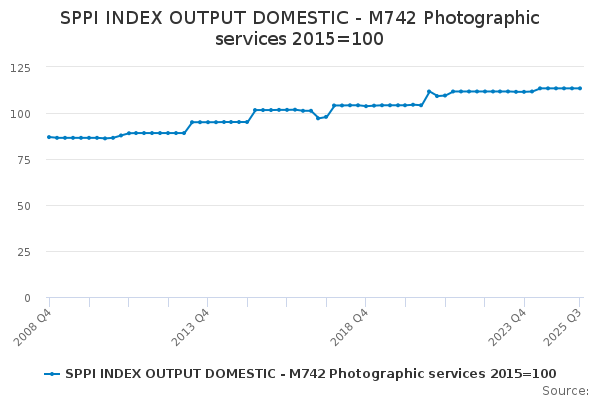 Download this time seriesSPPI INDEX OUTPUT DOMESTIC - M742 Photographic services 2015=100