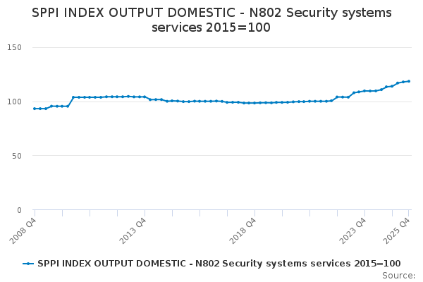 Download this time seriesSPPI INDEX OUTPUT DOMESTIC - N802 Security systems services 2015=100