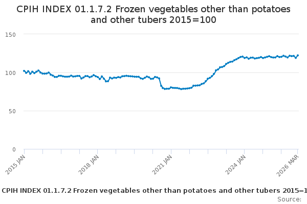 Download this time seriesCPIH INDEX 01.1.7.2 Frozen vegetables other than potatoes and other tubers 2015=100