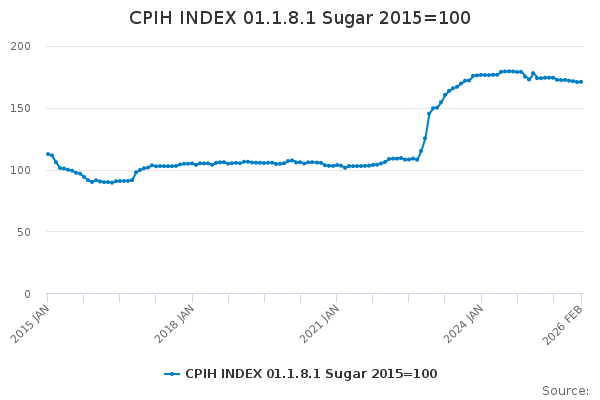 Download this time seriesCPIH INDEX 01.1.8.1 Sugar 2015=100