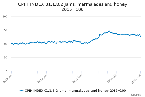 Download this time seriesCPIH INDEX 01.1.8.2 Jams, marmalades and honey 2015=100
