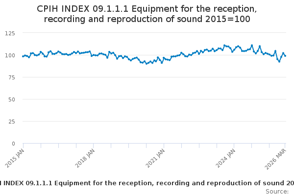 Download this time seriesCPIH INDEX 09.1.1.1 Equipment for the reception, recording and reproduction of sound 2015=100