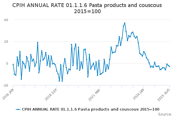 Download this time seriesCPIH ANNUAL RATE 01.1.1.6 Pasta products and couscous 2015=100