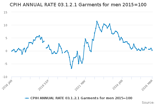 Download this time seriesCPIH ANNUAL RATE 03.1.2.1 Garments for men 2015=100