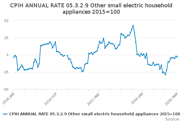 Download this time seriesCPIH ANNUAL RATE 05.3.2.9 Other small electric household appliances 2015=100