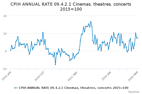 Download this time seriesCPIH ANNUAL RATE 09.4.2.1 Cinemas, theatres, concerts 2015=100