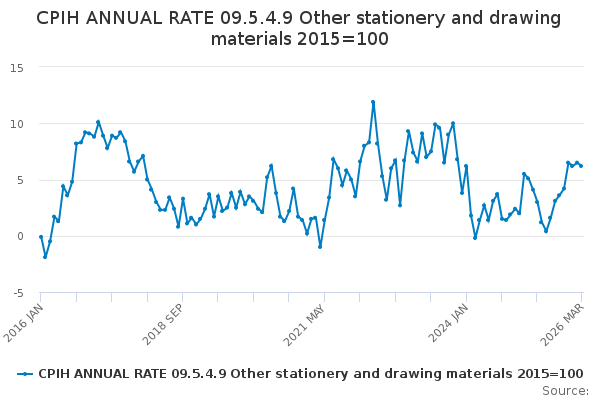 Download this time seriesCPIH ANNUAL RATE 09.5.4.9 Other stationery and drawing materials 2015=100