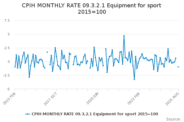 Download this time seriesCPIH MONTHLY RATE 09.3.2.1 Equipment for sport 2015=100