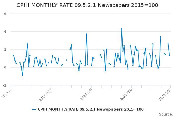 Download this time seriesCPIH MONTHLY RATE 09.5.2.1 Newspapers 2015=100