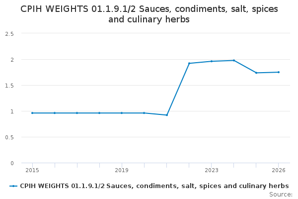 Download this time seriesCPIH WEIGHTS 01.1.9.1/2 Sauces, condiments, salt, spices and culinary herbs