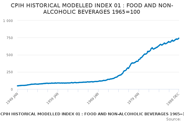 Download this time seriesCPIH HISTORICAL MODELLED INDEX 01 : FOOD AND NON-ALCOHOLIC BEVERAGES 1965=100