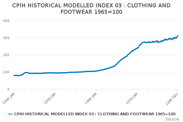 Download this time seriesCPIH HISTORICAL MODELLED INDEX 03 : CLOTHING AND FOOTWEAR 1965=100
