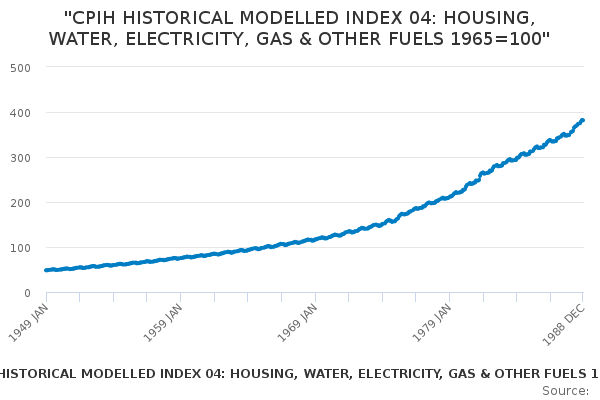 Download this time series"CPIH HISTORICAL MODELLED INDEX 04: HOUSING, WATER, ELECTRICITY, GAS & OTHER FUELS 1965=100"