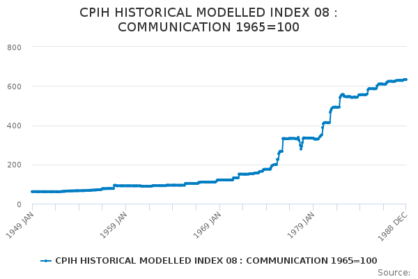 Download this time seriesCPIH HISTORICAL MODELLED INDEX 08 : COMMUNICATION 1965=100