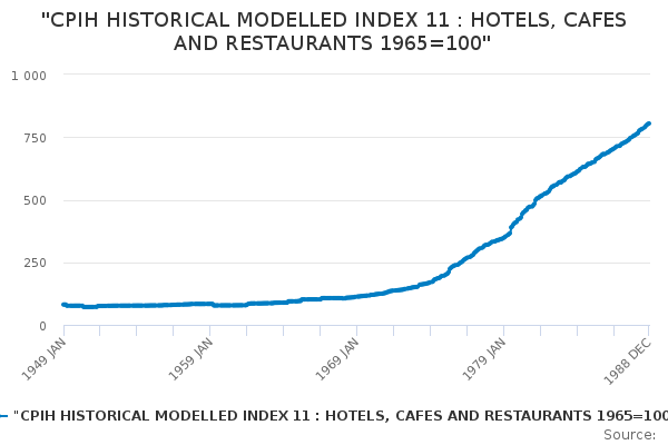 Download this time series"CPIH HISTORICAL MODELLED INDEX 11 : HOTELS, CAFES AND RESTAURANTS 1965=100"