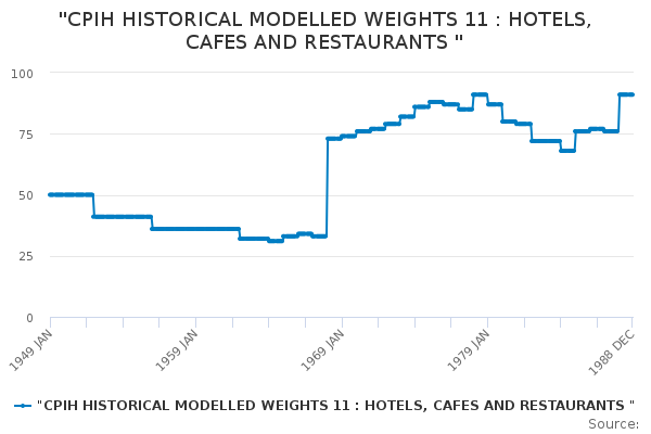 Download this time series"CPIH HISTORICAL MODELLED WEIGHTS 11 : HOTELS, CAFES AND RESTAURANTS "
