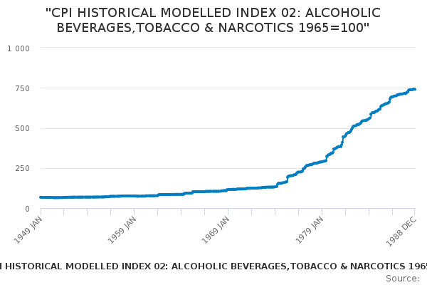 Download this time series"CPI HISTORICAL MODELLED INDEX 02: ALCOHOLIC BEVERAGES,TOBACCO & NARCOTICS 1965=100"