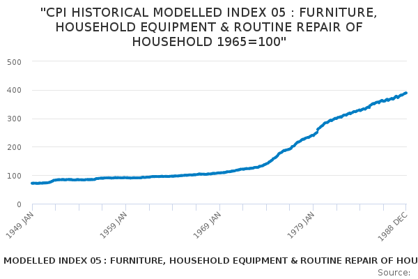 Download this time series"CPI HISTORICAL MODELLED INDEX 05 : FURNITURE, HOUSEHOLD EQUIPMENT & ROUTINE REPAIR OF HOUSEHOLD 1965=100"