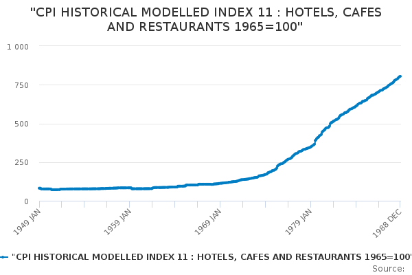 Download this time series"CPI HISTORICAL MODELLED INDEX 11 : HOTELS, CAFES AND RESTAURANTS 1965=100"