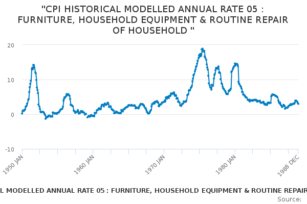 Download this time series"CPI HISTORICAL MODELLED ANNUAL RATE 05 : FURNITURE, HOUSEHOLD EQUIPMENT & ROUTINE REPAIR OF HOUSEHOLD "