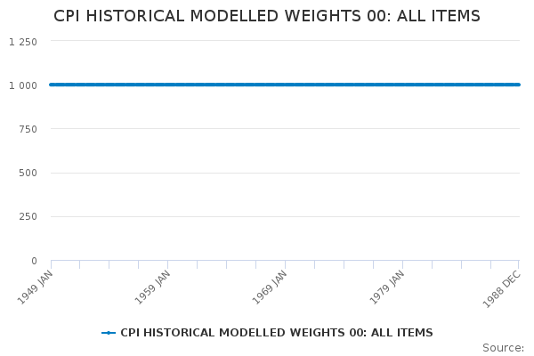 Download this time seriesCPI HISTORICAL MODELLED WEIGHTS 00: ALL ITEMS