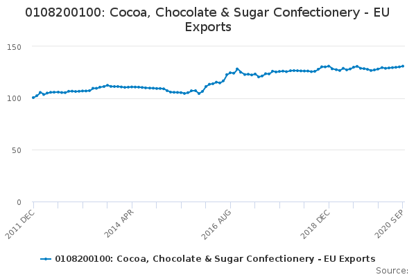 Download this time series0108200100: Cocoa, Chocolate & Sugar Confectionery - EU Exports