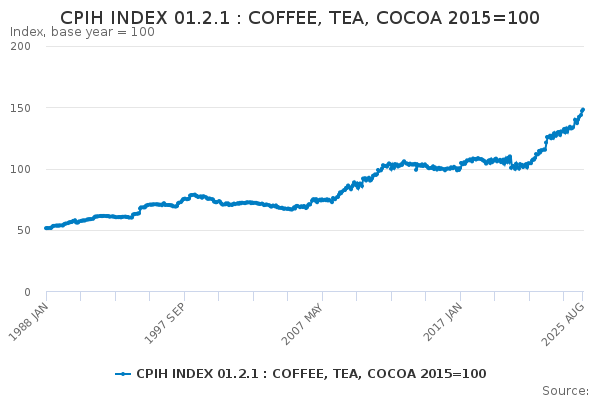 Download this time seriesCPIH INDEX 01.2.1 : COFFEE, TEA, COCOA 2015=100