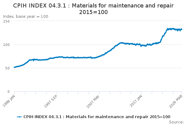 Download this time seriesCPIH INDEX 04.3.1 : Materials for maintenance and repair 2015=100