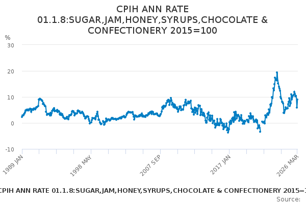 Download this time seriesCPIH ANN RATE 01.1.8:SUGAR,JAM,HONEY,SYRUPS,CHOCOLATE & CONFECTIONERY 2015=100