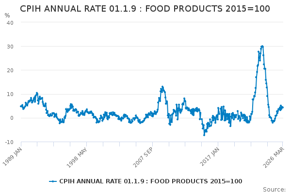 Download this time seriesCPIH ANNUAL RATE 01.1.9 : FOOD PRODUCTS 2015=100