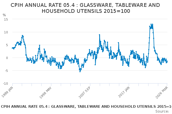 Download this time seriesCPIH ANNUAL RATE 05.4 : GLASSWARE, TABLEWARE AND HOUSEHOLD UTENSILS 2015=100