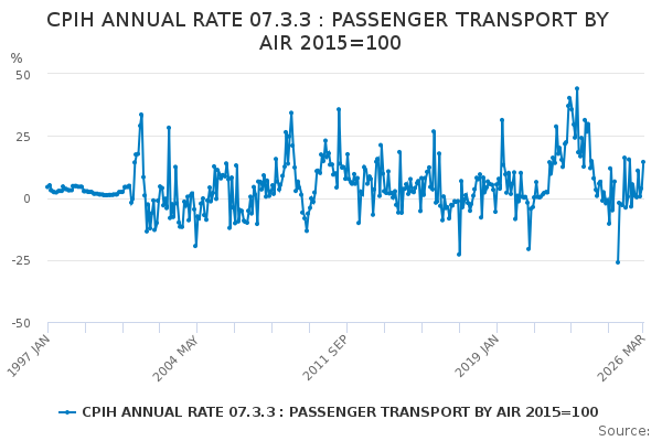 Download this time seriesCPIH ANNUAL RATE 07.3.3 : PASSENGER TRANSPORT BY AIR 2015=100