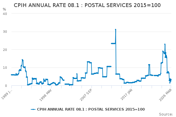 Download this time seriesCPIH ANNUAL RATE 08.1 : POSTAL SERVICES 2015=100