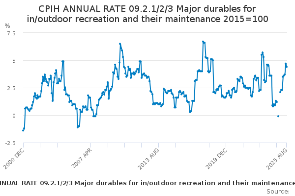Download this time seriesCPIH ANNUAL RATE 09.2.1/2/3 Major durables for in/outdoor recreation and their maintenance 2015=100