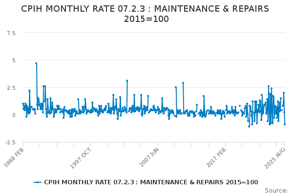 Download this time seriesCPIH MONTHLY RATE 07.2.3 : MAINTENANCE & REPAIRS 2015=100