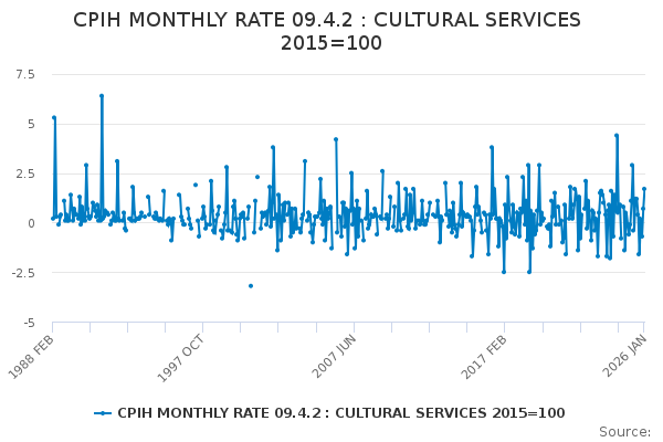 Download this time seriesCPIH MONTHLY RATE 09.4.2 : CULTURAL SERVICES 2015=100