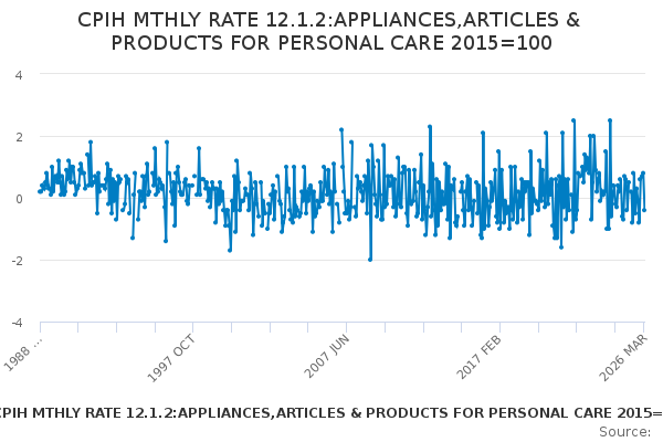 Download this time seriesCPIH MTHLY RATE 12.1.2:APPLIANCES,ARTICLES & PRODUCTS FOR PERSONAL CARE 2015=100