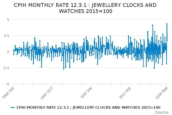 Download this time seriesCPIH MONTHLY RATE 12.3.1 : JEWELLERY CLOCKS AND WATCHES 2015=100